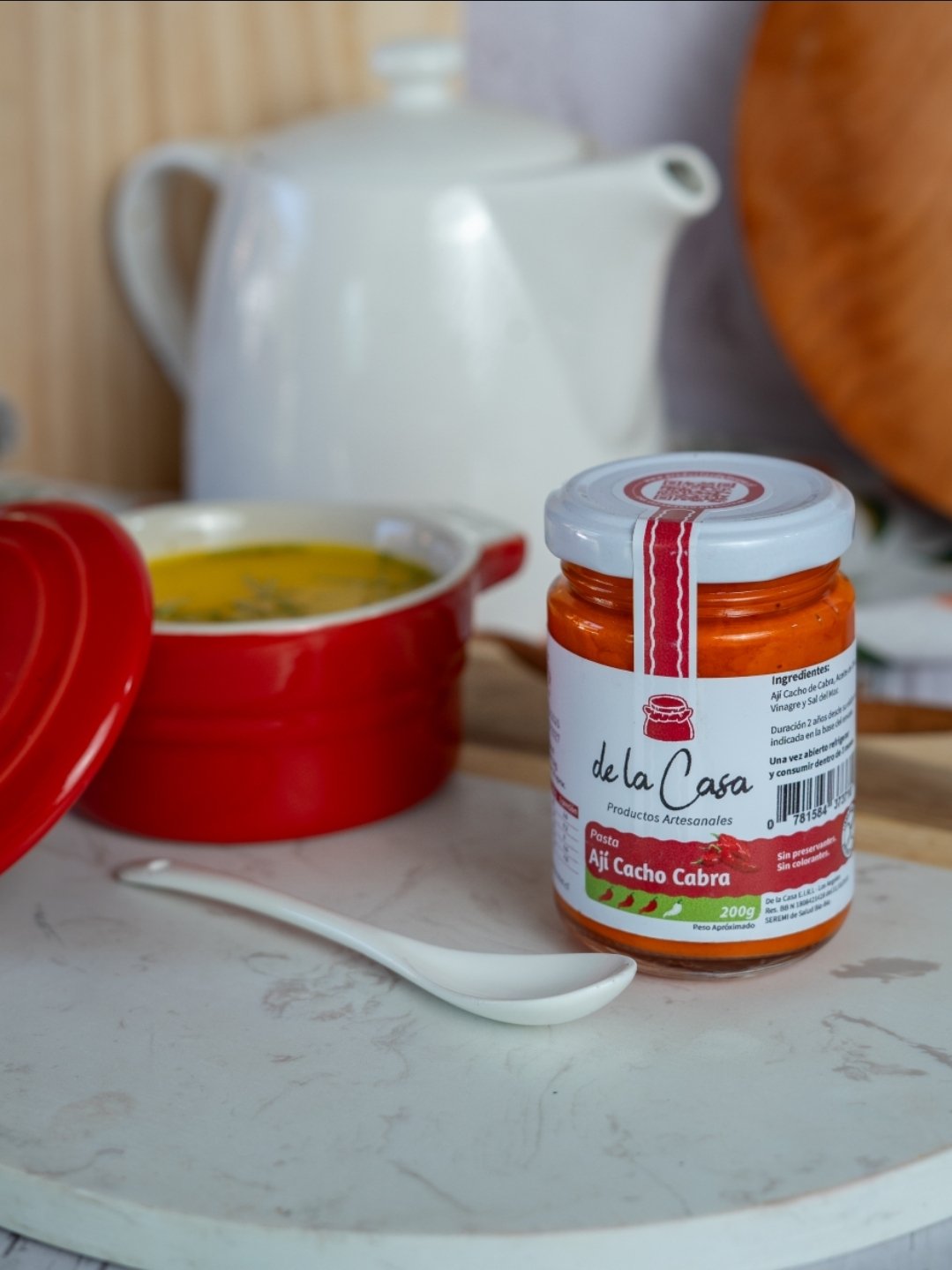 La pasta de ají cacho de cabra es un condimento popular en la cocina chilena. Se elabora a partir de ají cacho de cabra, una variedad de ají picante de forma alargada. La pasta se obtiene triturando y mezclando los ajíes con otros ingredientes como aceite de oliva, vinagre y sal de mar. Tiene un sabor intenso y picante, con notas frutales. Se utiliza para sazonar diversos platos, especialmente carnes, guisos y sopas, añadiendo un toque de calor y sabor característico.