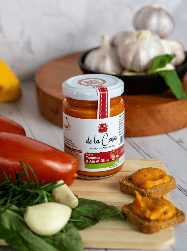 La pasta de tomates y ajos al olivo es una mezcla suave que combina ajos fritos en aceite de oliva, una reducción de tomates perita, acompañado de finas hierbas como albahaca, romero, orégano y laurel que aromatizan la mezcla, puedes usarla en la base de una pizza o sandwich, o untar directamente en tostadas.